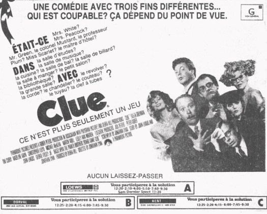 We discussed the Clue movie ad that had showtimes for each alternate ending. We found this one (in French):